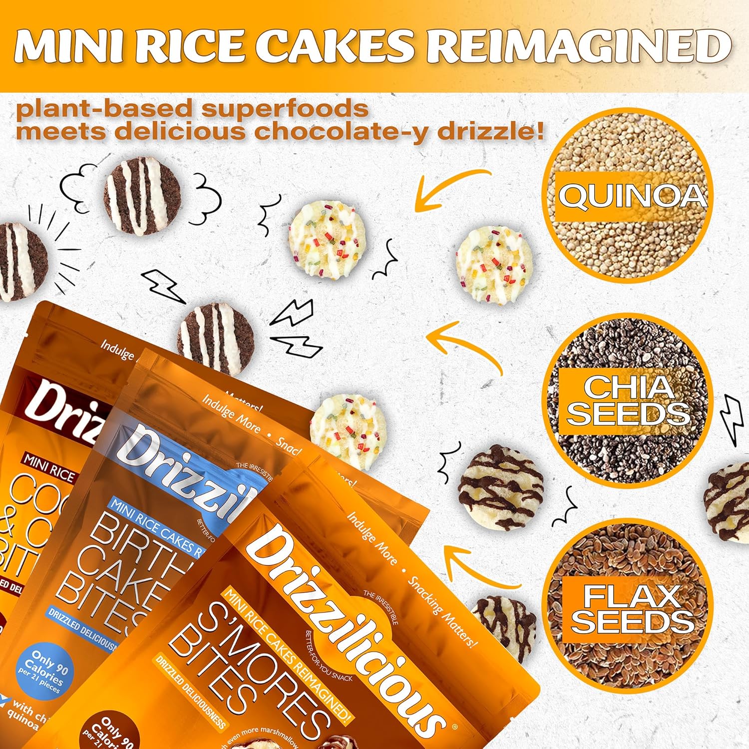 - LOW CALORIE DESSERT - Drizzlicious Mini Rice Cakes contain only 90 calories and 5 grams of sugar per bag. They're a better-for-you dessert alternative in individual bags for on-the-go snacking